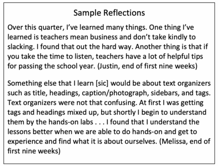 Then she asked them to write a reflection on their learning at the end of the nine weeks. Some students wrote about specific content they learned. Others reflected on how they learned.