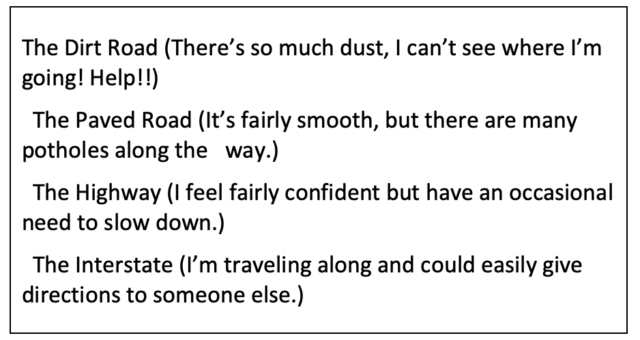 A teacher in one of my workshops shared a strategy to help students determine how well they understand the lesson. Rather than being totally open-ended, students choose one of four options. Her version used a travel metaphor: “Which Road Are You On?”