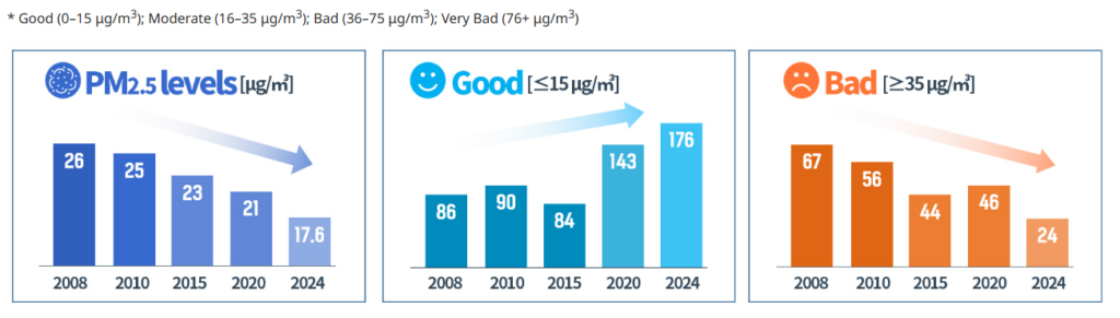 These efforts paid off big time. Emissions of most air pollutants have plummeted since 2000, and atmospheric concentrations of major ones have improved. Nationally, air quality has improved steadily over the past six years. In the latest Fine Dust Seasonal Management Period (December 1, 2024, to March 31, 2025), the average PM2.5 concentration hit a record low of 20.3 µg/m³—down 3.3% from the prior year and the best since the plan’s 2019 start, according to the Ministry of Environment. At this “normal” level, daily activities are generally safe, though sensitive folks with respiratory issues should mask up for long outdoor stints.