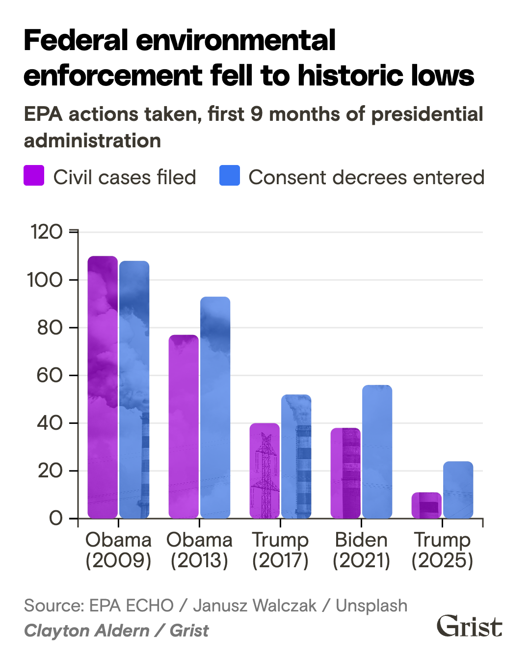 That pullback is already reshaping how often — and how forcefully — the government goes after polluters. Over the first nine months of both Trump’s first term and the Biden presidency, the Justice Department launched roughly 40 civil enforcement cases against polluters. During the same stretch last year, it initiated just 11. The slowdown extends to prosecutions as well. Under the previous two administrations, the number of consent decrees resulting from federal cases typically hovered around 50. Last year, that figure fell to just 24, weakening one of the federal government’s most effective tools for forcing cleanup and compliance.