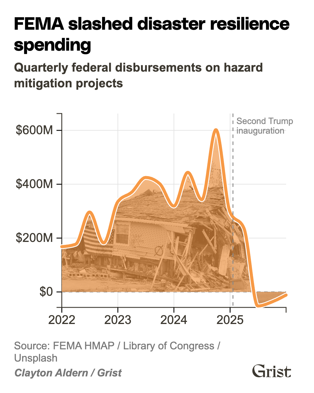 That effort came to a stop earlier this year after Trump vowed to shrink federal spending. Homeland Security Secretary Kristi Noem announced all FEMA payments above $100,000 would require her approval, reportedly creating a billion-dollar backlog of transactions. Quarterly spending on the program fell from a peak of around $500 million under Biden to less than zero last year as FEMA clawed back money from some recipients.
