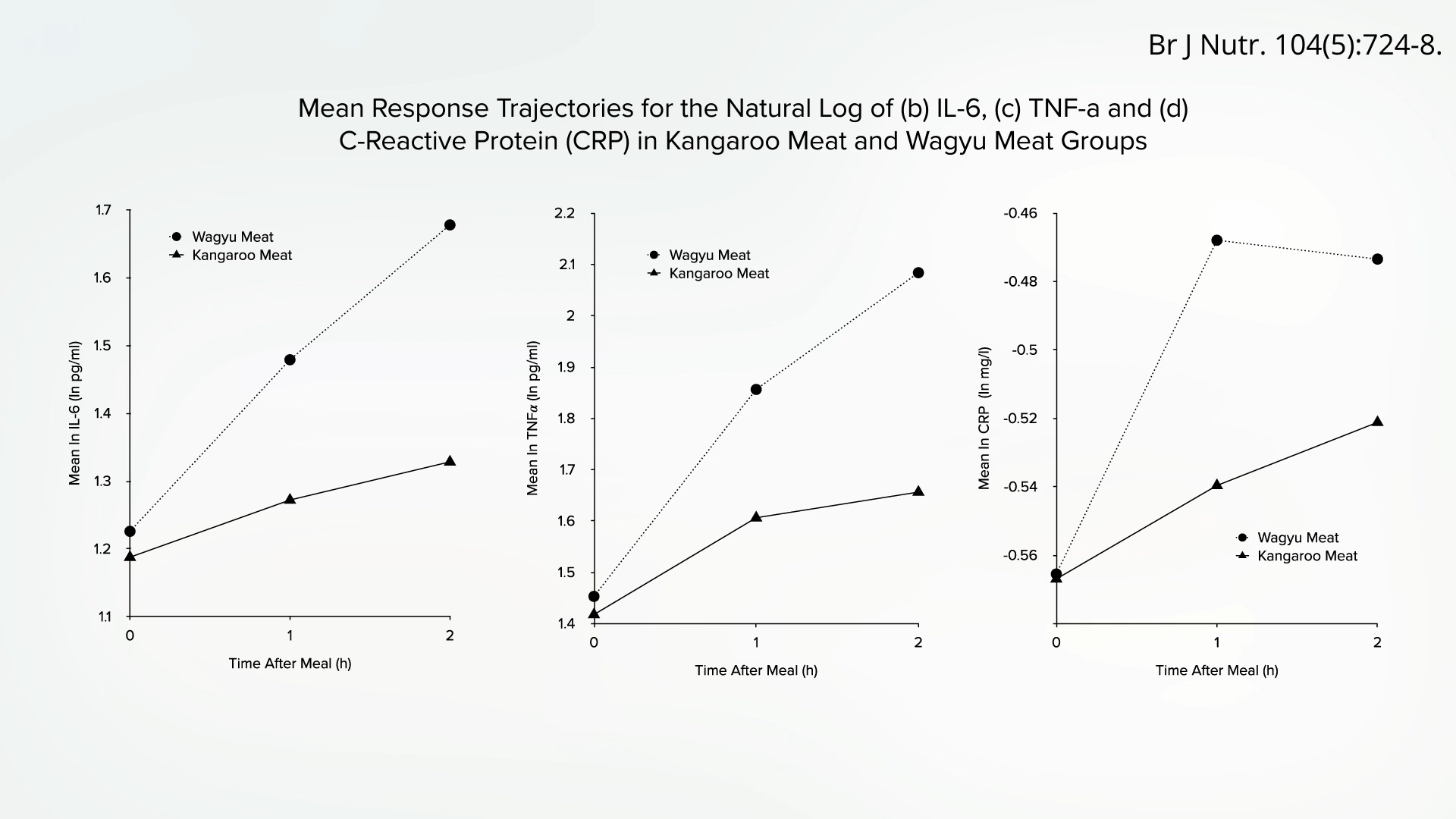 There are reviews purporting to show a drop in inflammatory markers after eating wild game, which is about as lean a meat as you can get, but that’s only compared to store-bought meat. Give people some really fatty meat and their IL-6 shoots up, as do their tumor-necrosis factor and C-reactive protein. Inflammatory, inflammatory, inflammatory—within hours of consumption. But what if you instead eat a kangaroo steak, which is extremely low in fat, similar to elk or moose? You’ll get the same strong inflammatory response within hours of eating it, as you can see below and at 3:15 in my video.